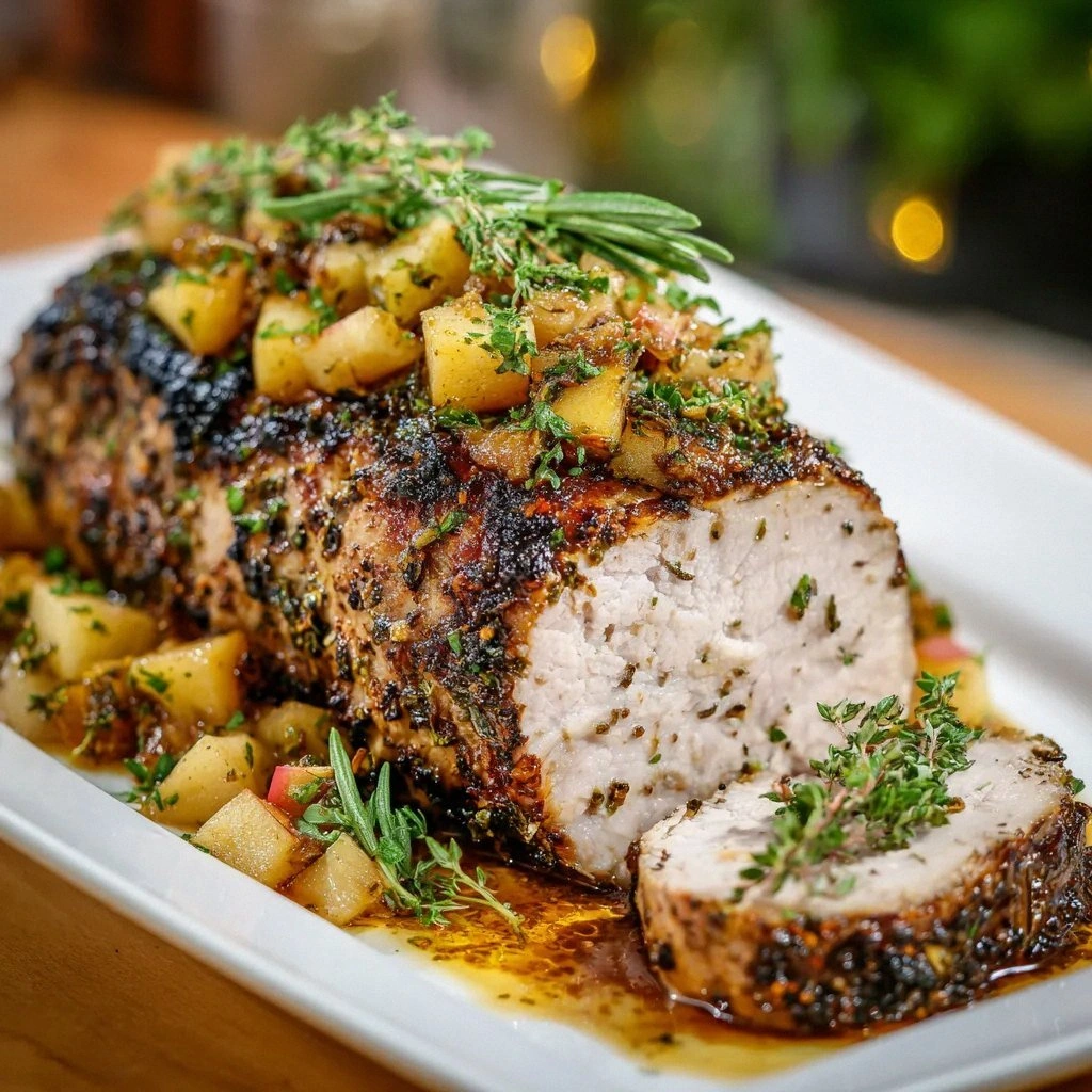 The moment the pork hits the oven, the air fills with a fragrant bouquet of rosemary, thyme, and garlic. The sizzling sound is like a drumbeat, signaling that the crust is forming—crisp edges that crackle like thin ice under a sudden burst of heat. You can already taste the caramelized apples, their sweet‑tart flavor dancing on your tongue, balanced by a splash of apple cider and a hint of lemon. The texture is a harmonious contrast: a buttery, juicy interior wrapped in a golden, herb‑laden shell that shatters with every bite.
