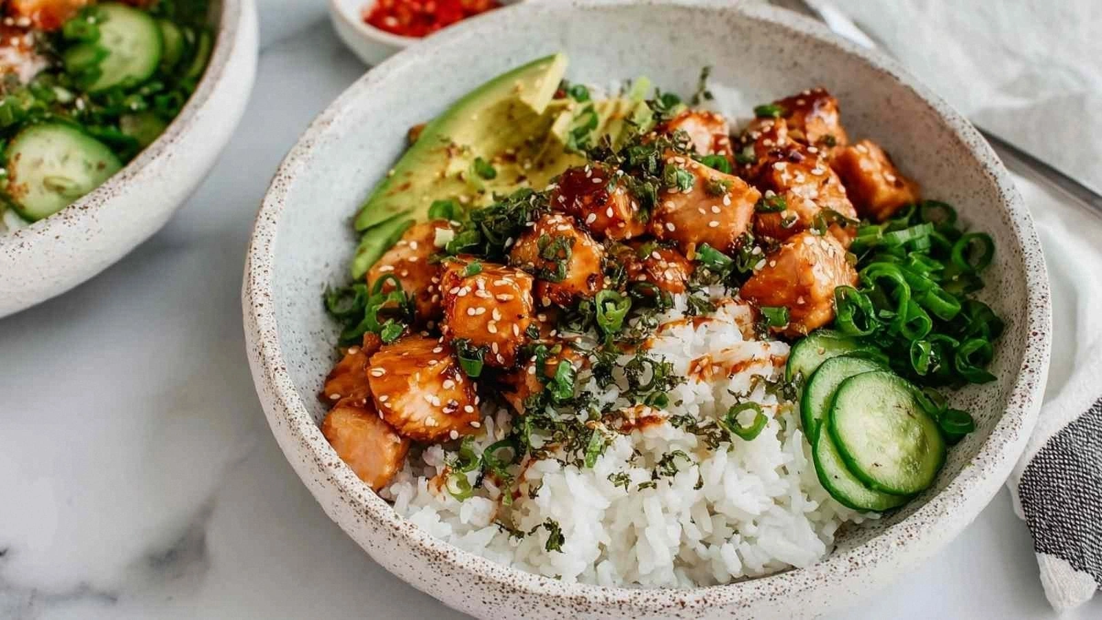 - Step 8: Serve Immediately Serve the bowls hot, letting the steam rise and the flavors mingle. The rice should still be warm, the salmon juicy, and the sauce silky. The first bite should be a harmonious explosion of sweet, spicy, umami, and fresh notes.